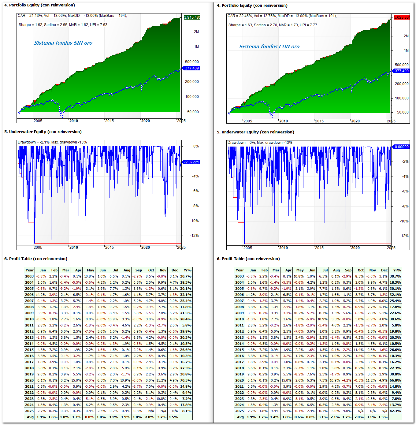 A continuación vemos los resultados del sistema fondos antes y después de añadirle el oro a la cesta de activos.