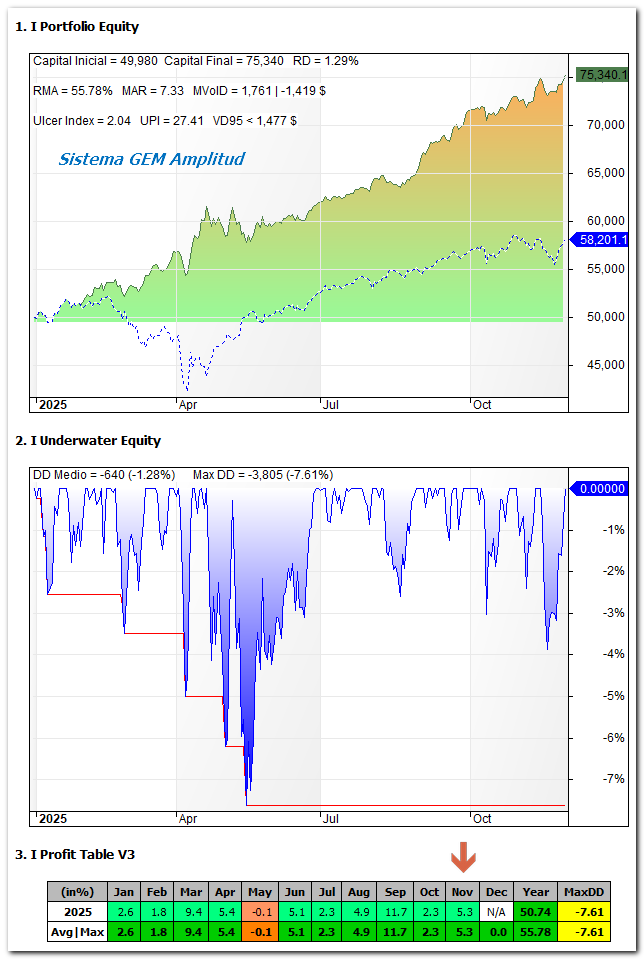 La verdad es que el sistema está dándole una verdadera paliza al SP500 (línea discontinua azul), llevando en el año algo más del 50% de rentabilidad.